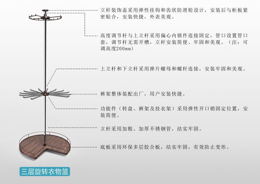 可 360 度旋轉,多功能轉角衣柜收納五金,可掛衣服、褲子,可放置衣物。充分利用衣柜轉角空間,方便存取。