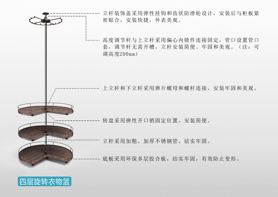 可 360 度旋轉,多功能轉角衣柜收納五金,可掛衣服,可放置衣物。充分利用衣柜轉角空間,方便存取。
