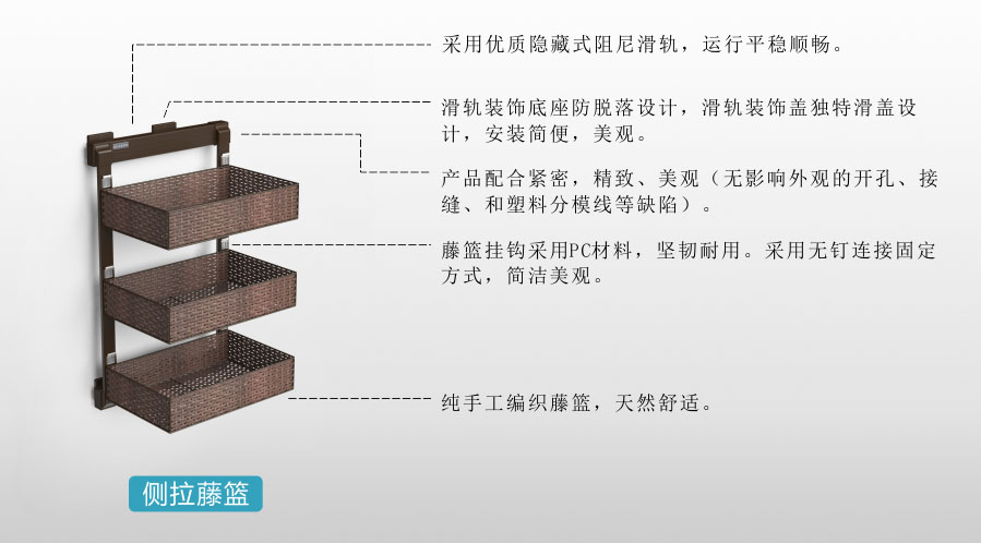 采用高品質鋁合金框架,連接件采用優質 ABS 工程塑料及PC 塑料,產品結實牢固。采用優質隱藏式阻尼滑軌,推拉順滑。獨特結構設計,安裝簡便、外觀簡潔美觀。
