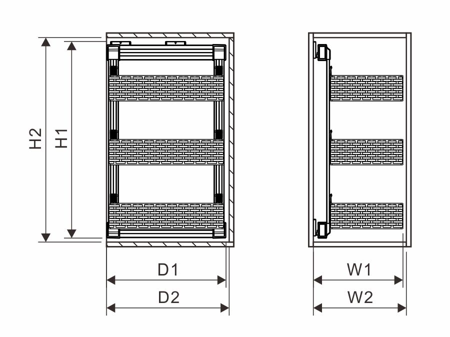 | 型號 | 柜體規格 | 外觀尺寸 寬(W1)x高(H1)x深(D1) | 柜體內空 寬(W2)x高(H2)x深(D2) |